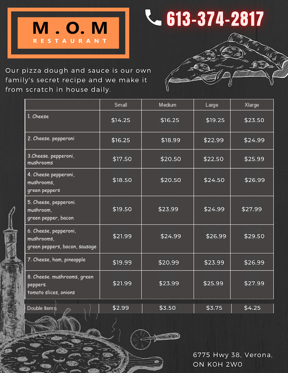 Welcome to M.O.M. Restaurant, your next favorite culinary destination located in the heart of Verona, Ontario. It's a cozy spot that promises an unforgettable dining experience, where comfort meets flavor.